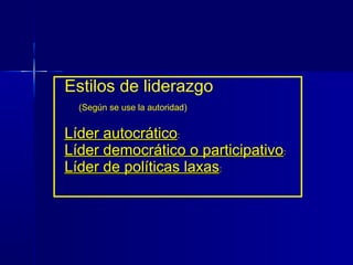 Este documento discute diferentes tipos de liderazgo, incluyendo liderazgo autocrático, democrático, de políticas laxas, carismático, transaccional y transformacional. También describe el liderazgo instructivo y la importancia de que los líderes se enfoquen en el aprendizaje de los estudiantes más que en la enseñanza. Además, analiza la cultura institucional y los valores organizacionales que guían el funcionamiento de las escuelas.