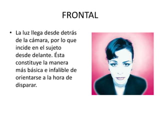 El documento describe diferentes tipos de luz para fotografía: la luz frontal es la más básica, la luz lateral resalta luces y sombras dándole profundidad a la imagen pero requiere experiencia, la contraluz puede dejar al sujeto como sombra a menos que se use flash, la luz cenital incide verticalmente desde arriba desfigurando rostros, y la luz baja ilumina el objeto de forma apagada.