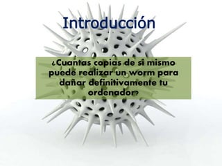 Este documento proporciona información sobre gusanos informáticos. Explica que los gusanos son programas que se replican a sí mismos en diferentes sistemas sin necesidad de un archivo anfitrión. Describe cómo los gusanos funcionan replicándose y enviando copias de sí mismos que pueden dañar los ordenadores y servidores. También distingue entre gusanos y virus, y enumera varios tipos de gusanos informáticos dañinos como Code Red, Blaster y Sobig. Por último, ofrece consejos sobre