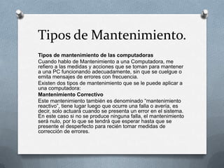 Este documento describe dos tipos de mantenimiento de computadoras: mantenimiento correctivo, que ocurre después de una falla, y mantenimiento preventivo, que se realiza de forma planificada antes de que ocurra una falla. El mantenimiento preventivo se recomienda hacer cada 3 meses y tiene varias ventajas como evitar paradas no planificadas, contar con un presupuesto y permitir actualizar la información técnica.