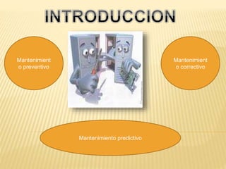 Este documento describe tres tipos de mantenimiento: mantenimiento preventivo, que incluye revisiones y reparaciones para garantizar el buen funcionamiento de los equipos; mantenimiento correctivo, que corrige defectos observados en equipos dañados o que dejaron de funcionar; y mantenimiento predictivo, que busca prevenir fallas mediante el cambio de piezas desgastadas y lubricantes antes de que ocurran problemas.