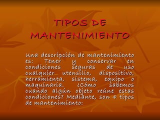 Este documento describe cuatro tipos de mantenimiento: correctivo, preventivo, predictivo y proactivo. El mantenimiento correctivo se lleva a cabo una vez que ocurre una falla, mientras que el preventivo se realiza de forma planificada antes de que ocurra una falla. El mantenimiento predictivo usa técnicas como análisis de vibraciones para detectar posibles fallas. Finalmente, el mantenimiento proactivo busca involucrar a toda la organización en las actividades de mantenimiento a través de la colaboración y sensibilización