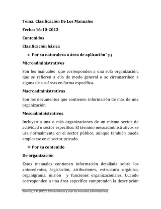 Este documento clasifica los manuales administrativos en varias categorías: por su naturaleza o área de aplicación (microadministrativos, macroadministrativos, mesoadministrativos); por su contenido (de organización, identificación, de procedimientos, de gestión de calidad, de historia de la organización, de políticas, de contenido múltiple, de puestos, de técnicas, de ventas, de producción, de finanzas, de personal, de operación, de sistemas); y por su ámbito (generales). Describe bre
