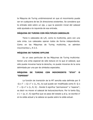 Este documento describe diferentes tipos de máquinas de Turing, incluyendo máquinas de Turing multicinta, no deterministas, multidimensionales, con múltiples cabezales, offline, con movimiento "stay", con cinta multipista y multidimensionales.