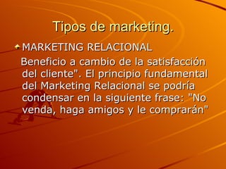 Este documento resume diferentes tipos de marketing como el marketing relacional, directo, virtual, de boca a boca y viral. Explica cada uno de estos tipos de marketing, sus características, beneficios y desventajas. También define el marketing directo y ofrece consejos sobre la selección de listas de clientes potenciales, segmentación del mercado, objetivos y estrategias de marketing.