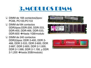 Los módulos de memoria RAM han evolucionado de los SIP de 30 pines a los DIMM más recientes de 240 pines. Los DIMM reemplazaron a los SIMM cuando los procesadores Pentium dominaron el mercado y existen en varias configuraciones de contactos. Los DIMM más comunes son de 168 contactos para SDR SDRAM y 184 contactos para DDR, pero los DIMM de 240 contactos soportan la más reciente tecnología DDR2 con hasta 2GB por módulo.