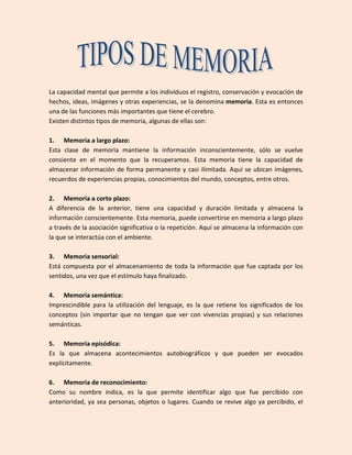 La memoria es la capacidad del cerebro para registrar, almacenar y recuperar información y experiencias. Existen varios tipos de memoria, incluyendo la memoria a corto plazo que almacena información de forma consciente pero temporal, la memoria a largo plazo que almacena información de forma permanente e inconsciente, y la memoria episódica que almacena recuerdos autobiográficos.