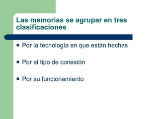 Las memorias se clasifican por tecnología, conexión y funcionamiento. Por tecnología incluyen memoria de tambor, núcleo de ferrita, bipolar, MOSFET y semiconductora. Por conexión incluyen DIMM y SIMM. Por funcionamiento incluyen RAM para almacenamiento temporal, ROM para instrucciones fijas, caché para acelerar el acceso a datos y flash para almacenamiento no volátil de alto rendimiento.