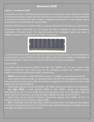 El documento describe los diferentes tipos de memoria RAM, incluyendo DRAM, EDO RAM, SDRAM, DDR-SDRAM y más. Explica que la RAM almacena datos temporalmente mientras la computadora está encendida y es más rápida que otros tipos de almacenamiento como discos duros. También describe cómo se empaquetan los chips de memoria en módulos SIMM y DIMM para conectarse a la placa base.