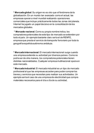 Este documento describe los diferentes tipos de mercados, incluyendo mercados de bienes perecederos y duraderos, bienes industriales y de servicios, así como mercados locales, regionales, globales, nacionales, internacionales e industriales.