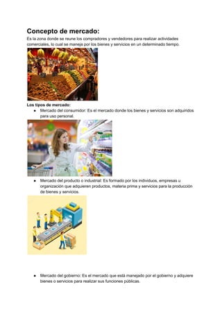 El documento proporciona una descripción detallada de los diferentes tipos de mercados, incluyendo el mercado del consumidor, el mercado industrial, y más. Además, aborda características del mercado de servicios, tipos de recursos, y el consumo de bienes, diferenciando entre productos duraderos e inmediatos. Se concluye con referencias que respaldan la información presentada.