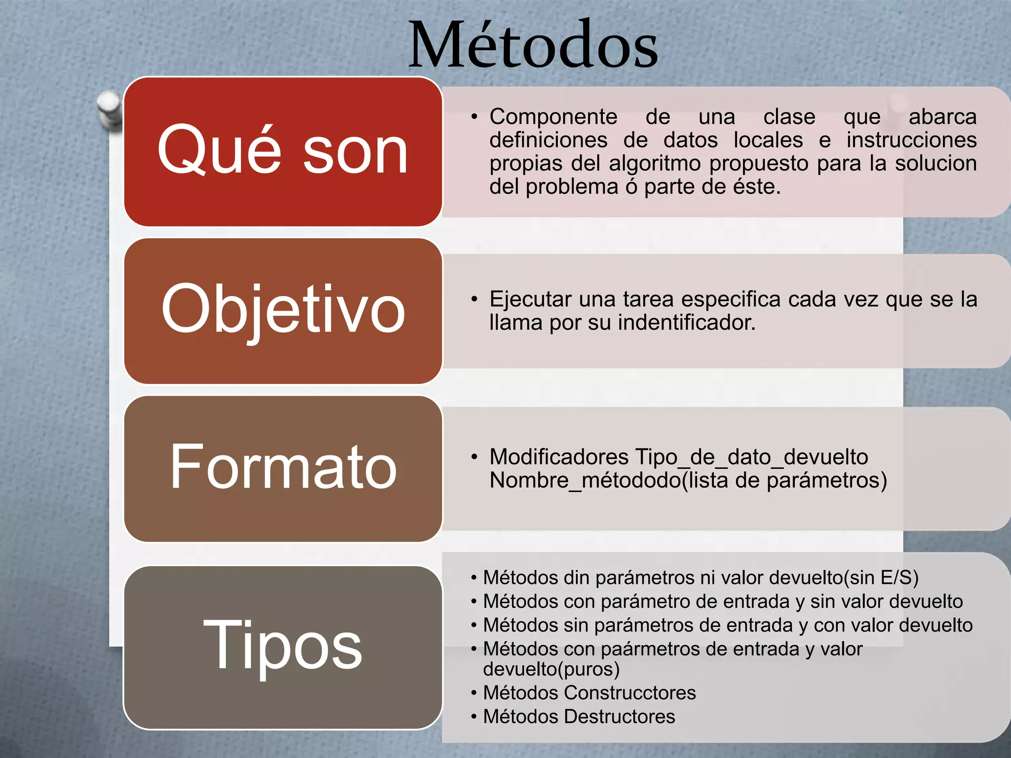 Este documento describe diferentes tipos de métodos en programación orientada a objetos, incluyendo métodos sin parámetros ni valor devuelto, métodos con parámetros de entrada pero sin valor devuelto, métodos sin parámetros de entrada pero con valor devuelto, y métodos con tanto parámetros de entrada como valor devuelto. También describe constructores y destructores como tipos especiales de métodos.