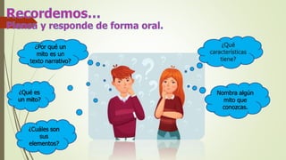Este documento presenta información sobre los mitos. Explica que los mitos son relatos tradicionales que usan personajes extraordinarios para explicar el origen del universo y de los elementos naturales. Describe los diferentes tipos de mitos como cosmogónicos, teogónicos y antropogónicos. Además, presenta el mito "La noche de Tatú" como ejemplo y brinda preguntas para analizarlo.