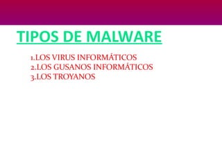 El documento describe tres tipos de malware: virus informáticos, gusanos informáticos y troyanos. Los virus infectan archivos y se replican cuando estos se ejecutan, pueden ocultarse y dañar sistemas. Los gusanos se replican a sí mismos de forma autónoma entre sistemas, propagándose rápidamente e infectando miles de ordenadores. Los troyanos se hacen pasar por programas legítimos pero dan acceso remoto no autorizado a hackers, pudiendo robar información, borrar archivos o descargar otros malware