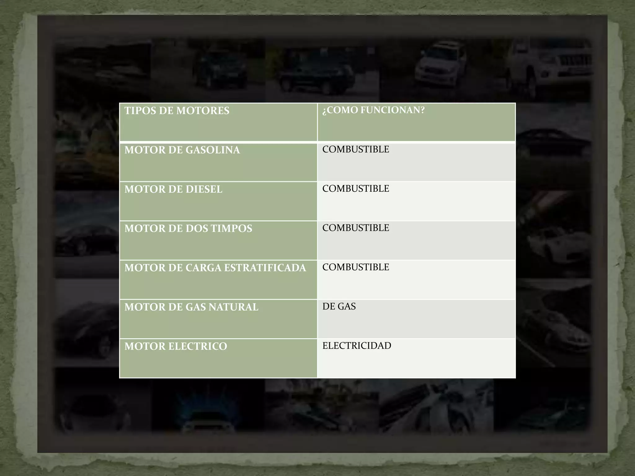 Este documento describe los diferentes tipos de motores y cómo funcionan. Los motores de gasolina, diesel, dos tiempos, carga estratificada y gas natural funcionan quemando combustibles como la gasolina o el gas natural. Los motores eléctricos funcionan usando electricidad. Cada tipo de motor sigue un proceso diferente de admisión, compresión, combustión y escape para generar movimiento.