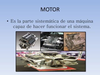 1. Un motor es la parte sistemática de una máquina capaz de hacer funcionar el sistema.
