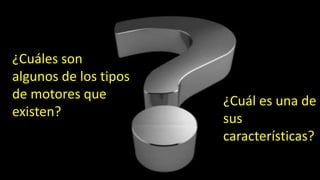 El documento describe diferentes tipos de motores, incluyendo motores de combustión interna y externa, motores eléctricos asíncronos y trifásicos, y motores híbridos en serie, paralelo y mixto. Los motores de combustión utilizan el principio del émbolo reciprocante, mientras que los motores eléctricos se basan en la acción del flujo giratorio o están formados por tres bobinados independientes. Los motores híbridos pueden ser impulsados por solo el motor eléctrico, por el motor de