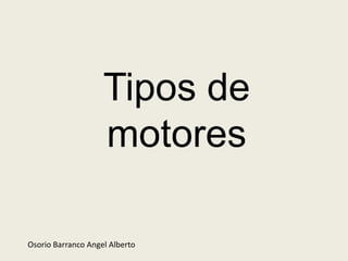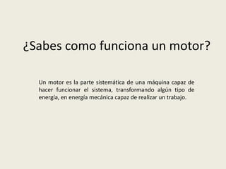 Este documento describe los diferentes tipos de motores, incluyendo motores de combustión interna, motores eléctricos, motores aeronáuticos y más. Explica que los motores térmicos transforman la energía química de un combustible en energía mecánica. Luego describe varios tipos comunes de motores de combustión interna, como motores en V, motores cilíndricos paralelos y motores boxer. Concluye que debemos seguir usando los motores de combustión más eficientes disponibles para reducir el impacto ambiental y