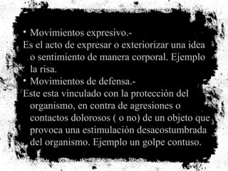 Este documento describe diferentes tipos de movimientos humanos. Identifica movimientos expresivos como la risa, movimientos de defensa como reacciones a golpes, movimientos motivados por la apropiación como el sexo, movimientos adaptativos para esquivar o evitar, movimientos transitivos para intervenir sobre objetos, movimientos parasitarios sin significado como los tics, y movimientos actitudinales como gestos de aprobación o desaprobación.