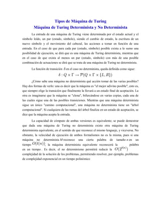 Las máquinas de Turing pueden ser deterministas o no deterministas. Una máquina de Turing determinista toma una única acción para cada par estado-símbolo, mientras que una no determinista puede tomar múltiples acciones. Una máquina no determinista se "bifurca" en múltiples copias que siguen diferentes caminos de ejecución, aceptando la entrada si alguna copia alcanza un estado de aceptación. Aunque ambos tipos de máquinas tienen la misma capacidad de cómputo, una máquina no determinista puede resolver problemas
