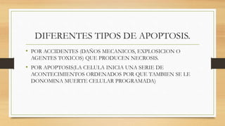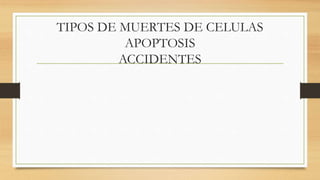 Hay dos tipos principales de muerte celular: la apoptosis y la necrosis. La apoptosis es la muerte celular programada donde la célula inicia una serie de eventos ordenados que conducen a su muerte de manera ordenada, mientras que la necrosis ocurre cuando las células sufren daños como quemaduras o radiación que causan su muerte desordenada.