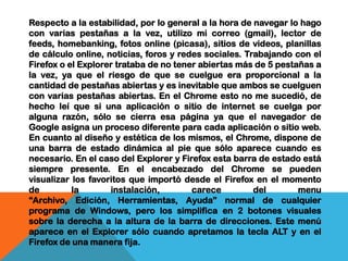El documento describe varios navegadores web populares, incluyendo Google Chrome, Mozilla Firefox, Internet Explorer y Opera. Explica brevemente el propósito de cada navegador, sus características principales, plataformas compatibles y cuota de mercado.