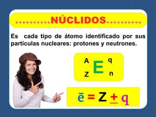 Este documento explica diferentes tipos de átomos como isótopos, isóbaros e isótonos. Define isótopos como átomos del mismo elemento con diferentes números de masa debido a diferentes cantidades de neutrones. Define isóbaros como átomos de diferentes elementos con la misma masa atómica. Define isótonos como átomos con el mismo número de neutrones. También explica iones, cationes y aniones.