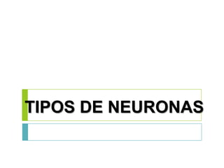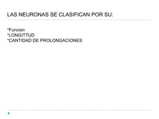 Las neuronas se clasifican por su función, longitud y cantidad de prolongaciones. Por su función incluyen neuronas motoras, piramidales, sensitivas y granulares. Por su longitud incluyen neuronas Golgi I con axones de 1 metro o más y neuronas Golgi II con axones y dendritas cortas. Por su cantidad de prolongaciones incluyen neuronas unipolares con una proyección, neuronas bipolares con dos prolongaciones y neuronas multipolares con numerosas dendritas y un largo axón.