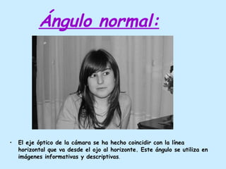 El documento describe diferentes ángulos de cámara y sus efectos expresivos. El ángulo normal alinea la cámara con el horizonte y se usa para imágenes informativas. El ángulo picado toma fotos desde arriba y hace que los sujetos parezcan más pequeños y frágiles. El ángulo contrapicado es lo opuesto al picado y hace que los sujetos parezcan más poderosos. El ángulo aberrante inclina la cámara para expresar acción o movimiento.