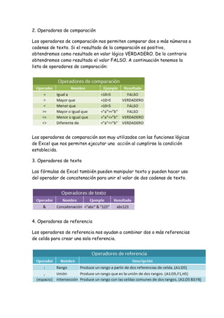 El documento describe los diferentes tipos de operadores en Excel, incluyendo operadores aritméticos, de comparación, de texto y de referencia. Explica que los operadores son símbolos que representan operaciones y que hay un orden de precedencia para calcular fórmulas con múltiples operadores, pero que los paréntesis permiten controlar este orden.