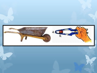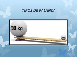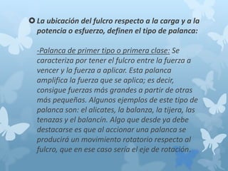 Este documento describe los cuatro tipos de palancas: palanca de primer tipo con el fulcro entre la fuerza y la carga, palanca de segundo tipo con la carga entre el fulcro y la fuerza, palanca de tercer tipo con la fuerza entre el fulcro y la carga, y palancas múltiples que combinan varios tipos. Cada tipo de palanca produce un movimiento rotativo alrededor del fulcro y se ilustran ejemplos comunes como alicates, carretillas y brazos.