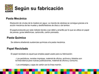 Este documento describe los diferentes tipos de papel según su método de fabricación, tamaño, acabado, forma y uso. Explica que el papel se produce principalmente por los métodos de pasta mecánica o química, y también a partir de papel reciclado. Luego detalla las características físicas del papel como humedad, orientación de fibras, opacidad y gramaje. Finalmente, enumera los usos comunes del papel como impresión, prensa, cartón, embalaje y documentos de valor.