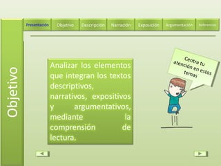 Este documento presenta los diferentes tipos de textos, sus características estructurales y su intención comunicativa. Explica que existen textos descriptivos, narrativos, argumentativos y científicos. Describe brevemente cada tipo de texto y su estructura típica, como la presentación, desarrollo y conclusión de los textos argumentativos. El objetivo es enseñar a diferenciar entre los tipos de textos para aprobar un examen de ingreso a la preparatoria.