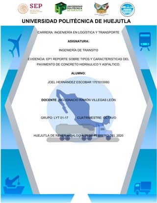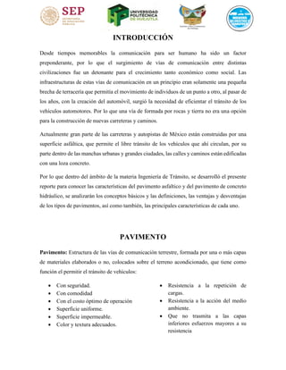 Este documento describe y compara los tipos de pavimento rígido y flexible. Explica que el pavimento rígido consiste en losas de concreto hidráulico mientras que el flexible se compone principalmente de una capa asfáltica sobre capas de base y sub-base. También analiza las características, ventajas y desventajas de cada tipo, señalando que el rígido tiene una mayor durabilidad pero también un costo inicial más alto.