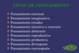 El documento describe diferentes tipos de pensamiento, incluyendo el pensamiento racional, imaginativo, creador, inductivo, abstracto, reproductivo, productivo, divergente y convergente. Define cada uno y explica sus características principales, como el uso de la lógica, la imaginación, la creatividad, el nivel de abstracción, la novedad de las soluciones, y si un problema tiene una o varias posibles respuestas.