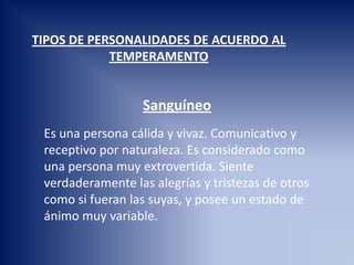 Este documento describe los cuatro principales temperamentos de personalidad: sanguíneo, flemático, melancólico y colérico. El temperamento sanguíneo se caracteriza por ser cálido, comunicativo y receptivo a las emociones de los demás. El temperamento flemático se caracteriza por ser tranquilo, equilibrado y evitar involucrarse demasiado. El temperamento melancólico se caracteriza por ser sensible, analítico y perfeccionista. Finalmente, el temperamento colérico se caracteriza por ser rápido, activo, independiente y