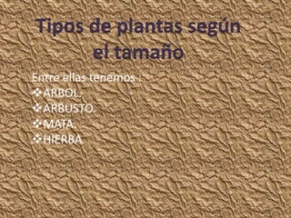 Existen varios tipos de plantas clasificadas según su tamaño, constitución y duración. Según el tamaño están los árboles que miden más de 5 metros, los arbustos de 1 a 5 metros, las matas menores a 1 metro y las hierbas sin estructura leñosa. Según su constitución están las plantas no vasculares como musgos y hepáticas, las vasculares con sistema de conducción de savia y las gimnospermas con semillas desnudas. Según su duración están las anuales que viven una temporada,