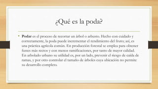 El documento describe los diferentes tipos de poda y sus implementos. Explica que la poda es el proceso de recortar árboles y arbustos, y que existen diferentes tipos como la poda de copa, la poda de formación, la poda de aclareo, la poda de invierno y la poda de verano. También enumera cinco implementos comunes para realizar la poda como tijeras de una y dos manos, serruchos de poda y tijeras de perfilar.