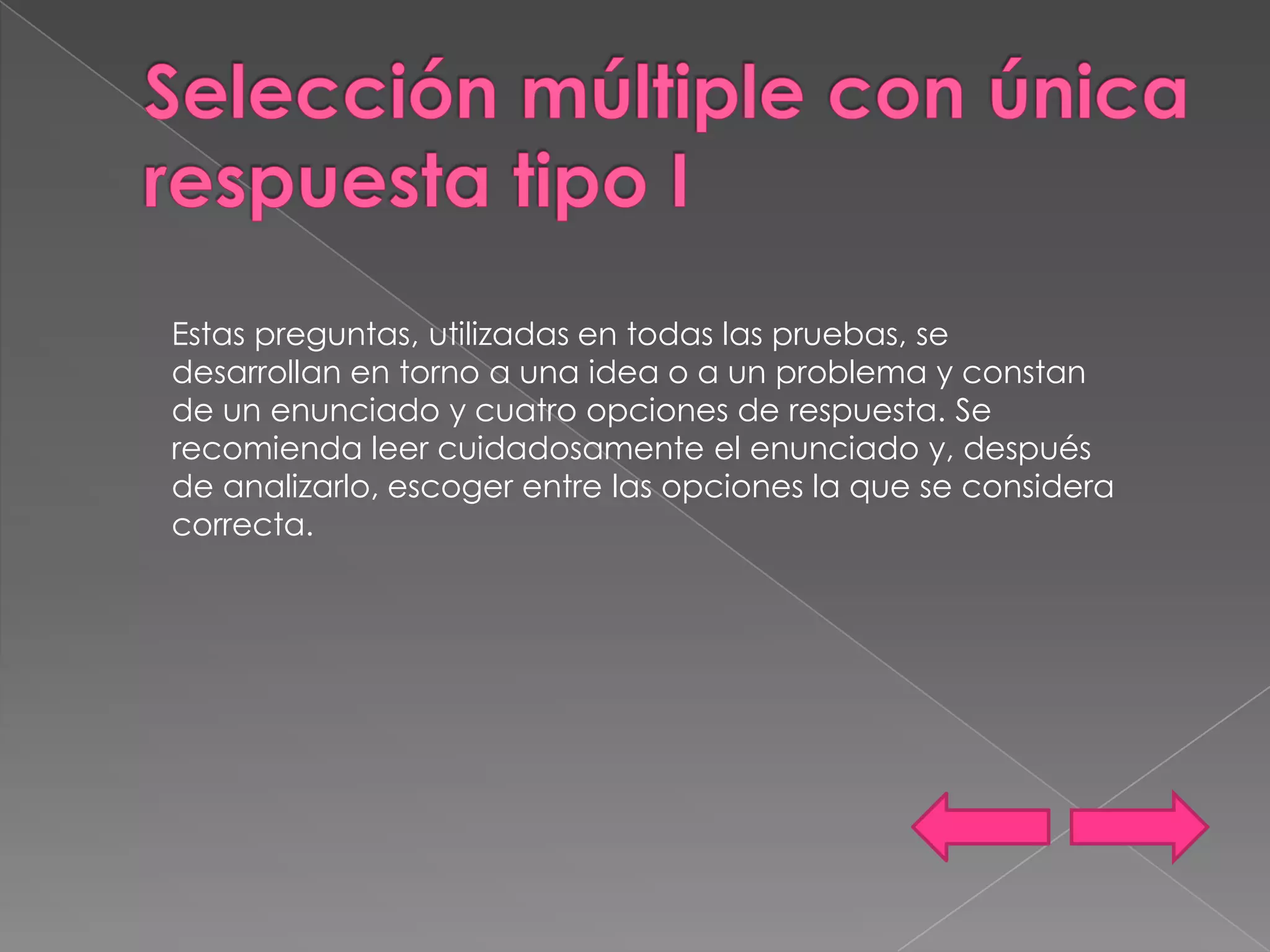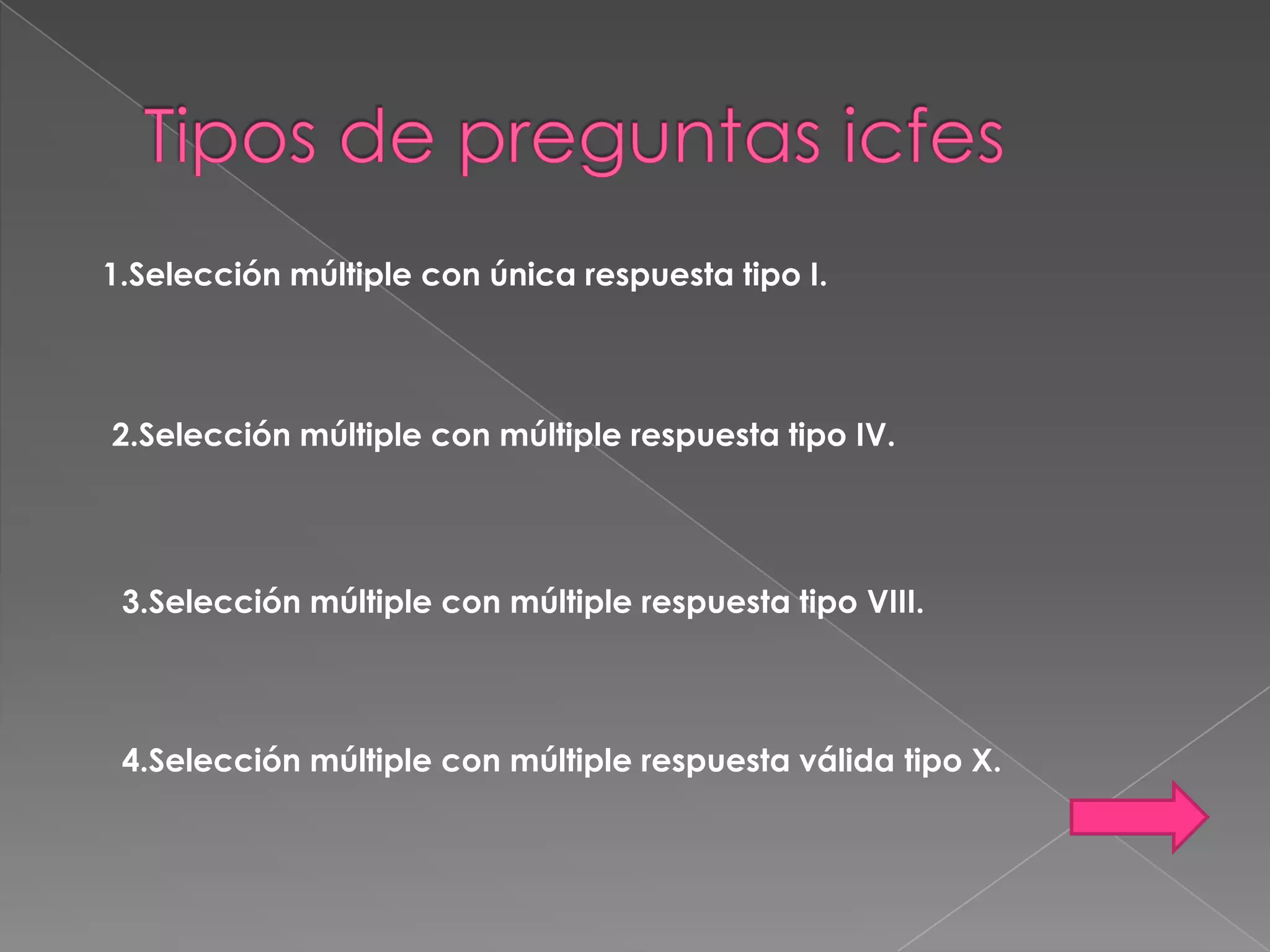 El documento describe cuatro tipos de preguntas de selección múltiple utilizadas en pruebas de evaluación. Tipo I ofrece una única respuesta correcta, Tipo IV permite múltiples respuestas correctas, Tipo VIII evalúa la relación entre afirmaciones y justificaciones, y Tipo X evalúa cuáles de varias consecuencias se aplican a un enunciado.