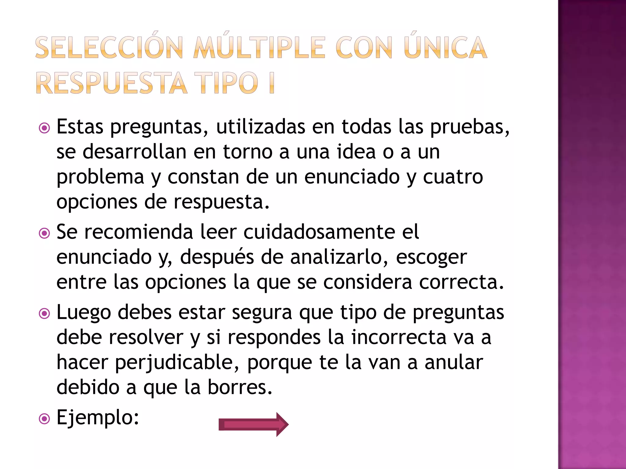  Estas preguntas,utilizadas en todas las pruebas, se desarrollan en torno a una idea o a un problema y constan de un enunciado y cuatro opciones de respuesta.  Se recomienda leer cuidadosamente el enunciado y, después de analizarlo, escoger entre las opciones la que se considera correcta.  Luego debes estar segura que tipo de preguntas debe resolver y si respondes la incorrecta va a hacer perjudicable, porque te la van a anular debido a que la borres.  Ejemplo: