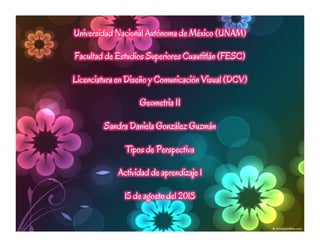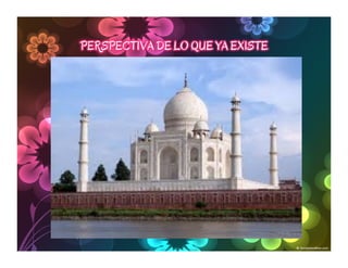 El documento presenta una lista de 12 tipos diferentes de perspectiva, incluyendo la perspectiva de lo que ya existe, de lo que no existe pero se producirá, y de lo que no existe y nunca existirá. También describe la perspectiva estereoscópica, de tamaño acostumbrado, aérea, de detalle, de tamaño, lineal, de tono y matiz, de gradiente de textura, de interposición, de paralaje de movimiento, y de convergencia visual.