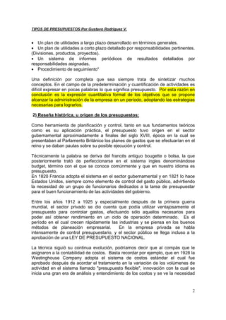 Este documento presenta una introducción general sobre los presupuestos. Explica que los presupuestos son planes financieros detallados que ayudan a las organizaciones a alcanzar sus objetivos estratégicos. Luego describe brevemente los orígenes de los presupuestos en el sector público a finales del siglo XVIII y cómo su uso se expandió al sector privado en el siglo XX. Finalmente, clasifica los diferentes tipos de presupuestos como rígidos, flexibles, a corto y largo plazo, del sector público y privado, y en