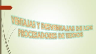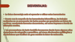El documento describe diferentes tipos de procesadores de texto, incluyendo Blog de notas y WordPad que son básicos con pocas herramientas, Abiword que es gratuito y funciona en múltiples sistemas operativos, y Tiny Easy Word que tiene herramientas no convencionales. Luego menciona a Writer de OpenOffice, KOffice y Microsoft Word como los más completos, especialmente Word que viene empaquetado con otros programas de Microsoft y permite guardar en diferentes formatos y versiones.