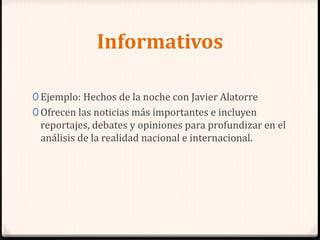 El documento clasifica diversos tipos de programas televisivos en México, incluyendo informativos, de entretenimiento, culturales y de concursos, destacando ejemplos representativos de cada categoría. Estos programas reflejan la diversidad de contenidos que buscan educar, entretener e interactuar con diferentes públicos, desde familias hasta jóvenes y niños. Se aborda también la crítica a la naturaleza exhibicionista de algunos formatos, como los reality shows.
