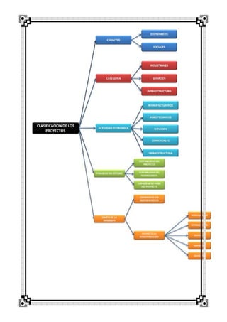 Este documento clasifica y describe diferentes tipos de proyectos. Los proyectos se pueden clasificar según su carácter (económico o social), categoría (producción de bienes, servicios o infraestructura), sector económico (agropecuario, manufacturero, etc.) y finalidad (creación de un nuevo negocio, modernización, etc.). También se describen los diferentes tipos de proyectos que entran en cada categoría, como proyectos agropecuarios, de servicios, de infraestructura social y económica.