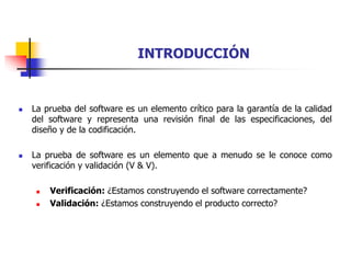 El documento describe los diferentes tipos de pruebas de software, incluyendo pruebas de unidad, integración, validación, sistema, caja blanca y caja negra. Explica que las pruebas de unidad prueban módulos individuales, mientras que las pruebas de integración prueban la interfaz entre módulos. Las pruebas de validación y sistema verifican que el software cumple con los requisitos funcionales y se integra correctamente.