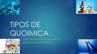 Este documento presenta un resumen de los diferentes tipos de química, incluyendo química orgánica, química analítica, química física, química inorgánica y bioquímica. Define cada una y brevemente describe su enfoque de estudio.