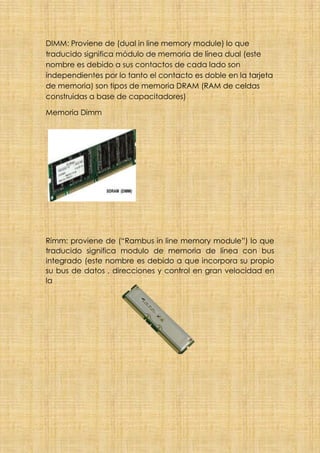 El documento describe diferentes tipos de RAM, incluyendo DIMM, RIMM, DDR, DDR2, DDR3 y DDR4. Explica que DIMM se refiere a módulos de memoria de línea dual, RIMM incorpora su propio bus integrado, y DDR, DDR2, DDR3 y DDR4 son estándares sucesivos de memoria RAM que mejoran el ancho de banda a través de la transmisión doble de datos.