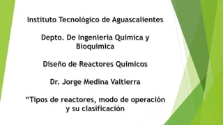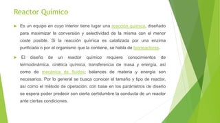 Este documento describe diferentes tipos de reactores químicos. Explica que un reactor químico es un equipo donde ocurren reacciones químicas diseñado para maximizar la conversión y selectividad de las reacciones. Luego describe varias clasificaciones de reactores como discontinuos vs continuos, ideales vs no ideales, homogéneos vs heterogéneos, y discute ejemplos específicos como los reactores batch, CSTR y PFR. Finalmente, cubre reactores catalíticos como de lecho fluidizado y empacado.