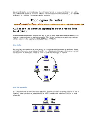 Existen 3 tipos principales de redes de computadora: redes de área local (LAN), redes metropolitanas (MAN) y redes de área amplia (WAN). Las LAN son redes privadas localizadas en un edificio o campus con una extensión de algunos kilómetros y velocidades entre 10 y 100 Mbps. Las MAN son versiones más grandes de las LAN que pueden ser públicas o privadas. Las WAN cubren amplias regiones geográficas como un país o continente y contienen elementos de intercambio de paquetes.